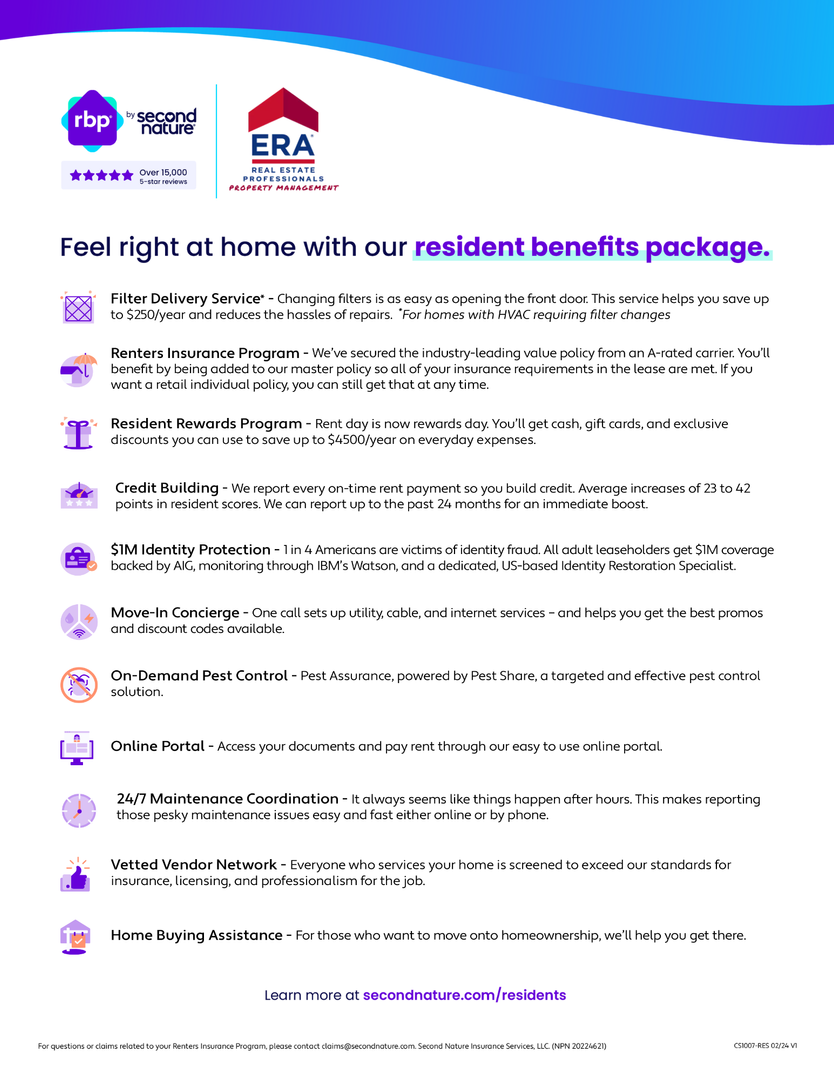 At ERA Real Estate Professionals - VA, we strive to provide an experience that is cost-effective and convenient. That’s why we provide a Resident Benefits Package (RBP) to address common headaches for our residents. Our program handles insurance, identity protection, pest control, air filter changes, utility set up, credit building, rent rewards, and more at a rate of $65.45/month, added to every property as a required program. More details upon application.